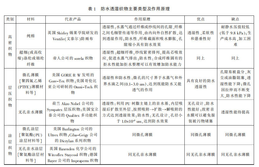 優質防水透濕面料可以在一定水壓下不被雨水潤濕或滲透,同時將人體散發的汗液蒸汽擴散或傳導到外界,降低人體微氣候區的濕度,增強穿著的舒適度和安全性。自1940年,研制出第一個防水透濕織物,目前,防水透濕面料已獲長足發展。根據加工工藝,防水透濕面料可分為高密織物、層壓織物和涂層織物,見表1。